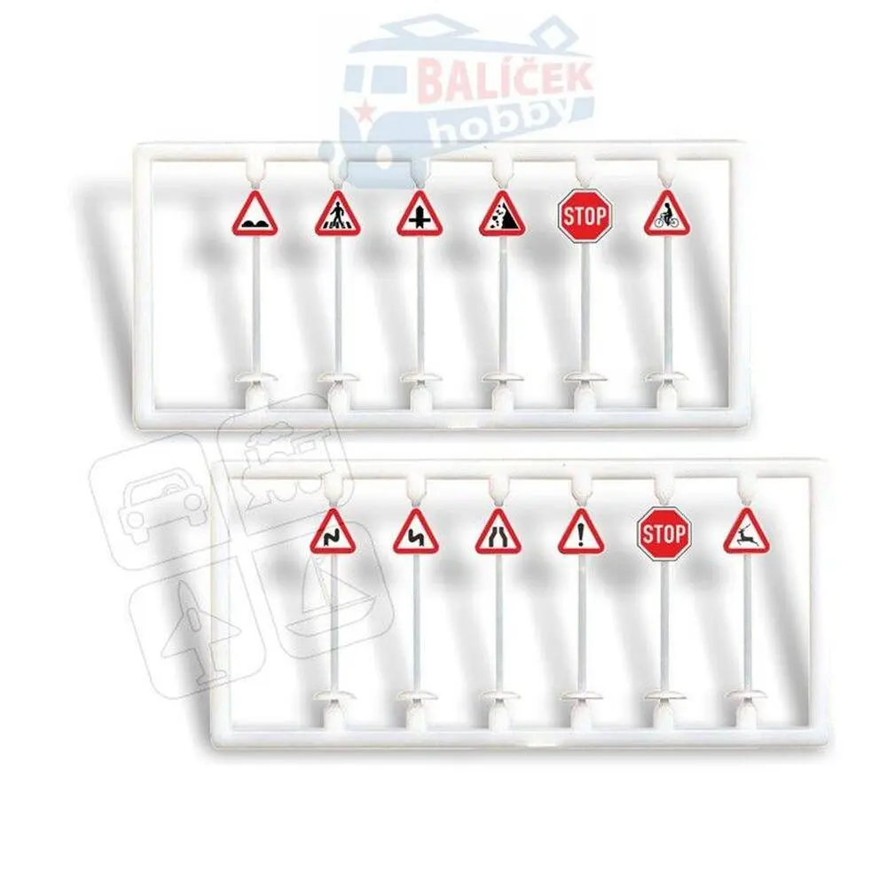 Plastový model dopravních značek v měřítku H0, vhodný pro drážní kolejiště - různé typy.