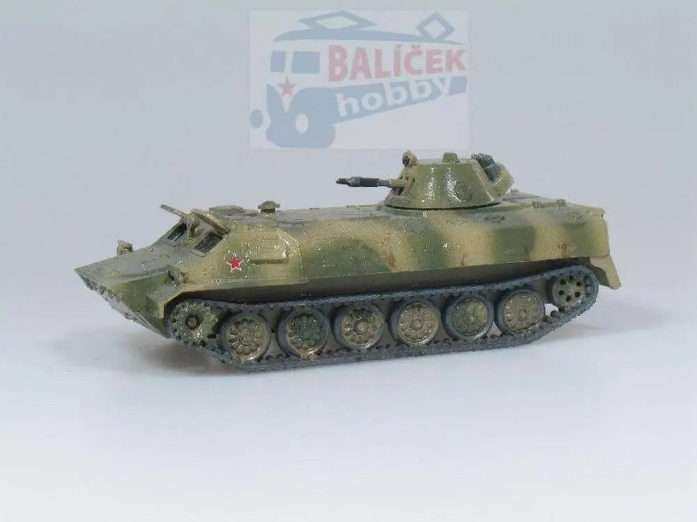 Kompletní plastiková stavebnice obrněného transportéru. Obsahuje probarvené plastikové výlisky na sestavení modelu a sadu obtisků.