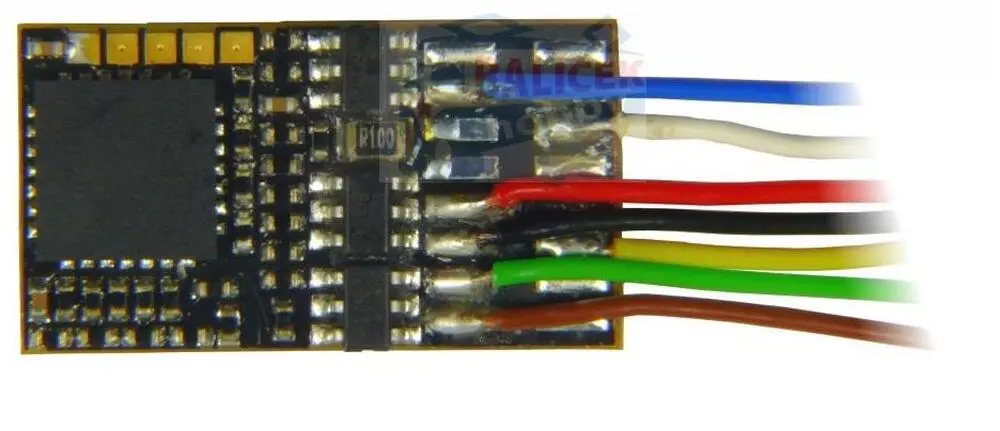 Funkční dekodér pro ovládání osvětlení a dalších funkcí v lokomotivě, řídícím voze nebo v osobních vagónech. Funkční výstupy mohou být směrově závislé. Dále je možné ovládat pomocí tohoto dekodéru 2 serva. Přidělení funkčních výstupů funkčním tlačítkům je samozřejmostí. Připojení pomocí vodičů