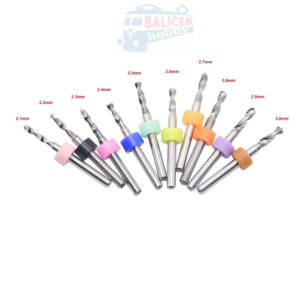 Sada velice kvlitních mikrovrtáků v sadě deseti ks od 2.1 do 3.0mm. Vrtáčky mají všechny stejný průměr stopky a to 3.175mm, takže jsou vhodné do ruční mikrovrtačky i jiných elektrických, jako jsou přímé brusky, fortunky atd.