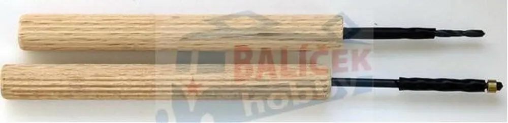 Sada obsahuje: 1 x vrták průměr 2,0 s mosazným dorazem pro vrtání otvoru pro zapuštění mosazného pouzdra na osu dvojkolí a 1 x vrták 1,7 mm, speciálně zbroušený pro úpravuí kuželovitého vybrání pouzdra. Oba vrtáky jsou pro lepší manipulaci kryty bužírkou a pro usnadnění ručního vrtání mají dřevěnou rukojeť.