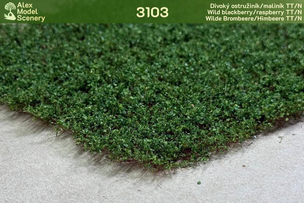 Náš starý, známý a trnitý, který se vyskytuje na každém náspu nebo podél cest. Realisticky imituje jak barvou, tak tvarem prorůstající šlahouny ostružiníku/maliníku, proto i po natrhání působí věrně. Varianta s jemnějšími listy a nižší výškou pro měřítko TT/N.