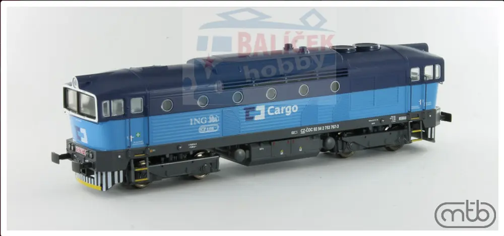 ČDC 753 767Diesel-elektrická lokomotiva řady 753.7. Model je vybaven motorem se setrvačníkem, přepínatelným osvětlením, dle směru jízdy, zvlášt zapínatelným reflektorem (pouze digitál), možná změna jasu reflektoru přepínačem na DPS, osvětlením stanoviště strojvedoucího. Lokomotiva je vybavena rozhraním Plux22.