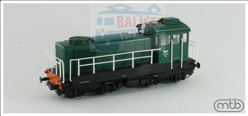 Model polské posunovací lokomotivy SM40. Lokomotivy SM40 byly vyrobeny v r 1955 v Maďarsku, továrnou MÁVAG/Ganz, shodné s M44. Lokomotivy s motorem výkonu 440kW a elektrickým přenosem byly primárně určeny pro posunovací službu, byly ale využívány i pro přepravu lehčích nákladních nebo osobních vlaků. Pozdější upravené provedení pod označením SM41 bylo u polských železnic nasazeno v počtu přes 260 ks.