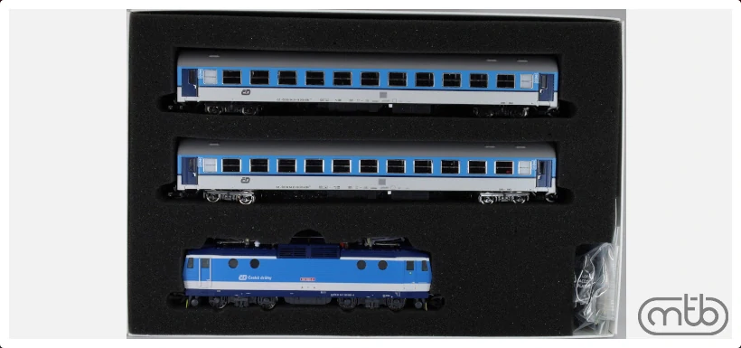 Set loko 163-035 a 2x vozu Bt. Vozy vybaveny DCC osvětlením, přiložen konfigurátor USB. Elektrická lokomotiva řady 163 (E499.3) byla vyráběná v několika seriích ve Škoda Plzeň 1984-92 v počtu 120ks+60ks upravené řady 162. Vznikla vypuštěním střídavé části z lokomotivy 363. Lokomotiva o výkonu 4 000 kW a vybavená tyristorovou regulací je určena pro vozbu vlaků na tratích ss napětí 3000 V, jako náhrada za řady 140 a 141. Po rozdělení v roce 1992 se stroje u ČD univerzálně používají pro nákladní i osobní vlaky, u ŽSR slouží jen v osobní přepravě. Později přistoupily ČD k rekonstrukci řad 162 na vyšší rychlosti či ČD -cargo k modifikaci na dvousystemové řady 363.5. model čísla 163-035 bude jen v setu, na samostatný prodej bude jiné číslo loko. Model čísla 163-062 bude jen v setu, doprodej dle objednávek. Na samostatný prodej bude jiné číslo loko, po Vánocích 25. Přiložen konfigurační modul DCC-prog k programování osvětlení, viz článek na webu MTB: https://www.mtb-model.com/index.php?page=clanky&id=4 Více informací k plánovaným novinkám najdete zde: https://www.mtb-model.com/index.php?page=clanky&id=17