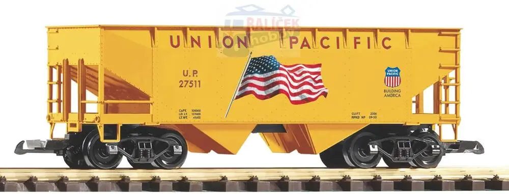 Novinka pro rok 2023: Násypný vůz Union Pacific Railroad s americkou vlajkou a nákladem rudy.