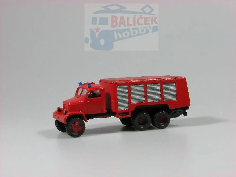 Kompletní plastiková stavebnice pěnového hasičského automobilu. Obsahuje probarvené plastikové výlisky na sestavení modelu, kovové osičky a sadu obtisků.