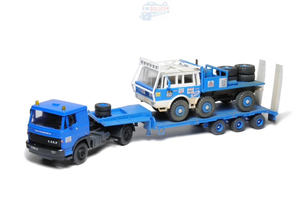 Kompletní plastiková stavebnice soupravy truck-trial. Obsahuje probarvené plastikové výlisky na sestavení modelů, kovové osičky a sadu obtisků.