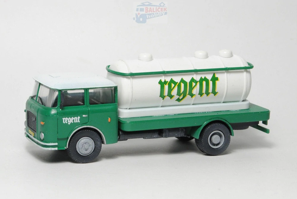 Kompletní plastiková stavebnice automobilu pro převoz piva. Obsahuje probarvené plastikové výlisky na sestavení modelu, kovové osičky a sadu obtisků.