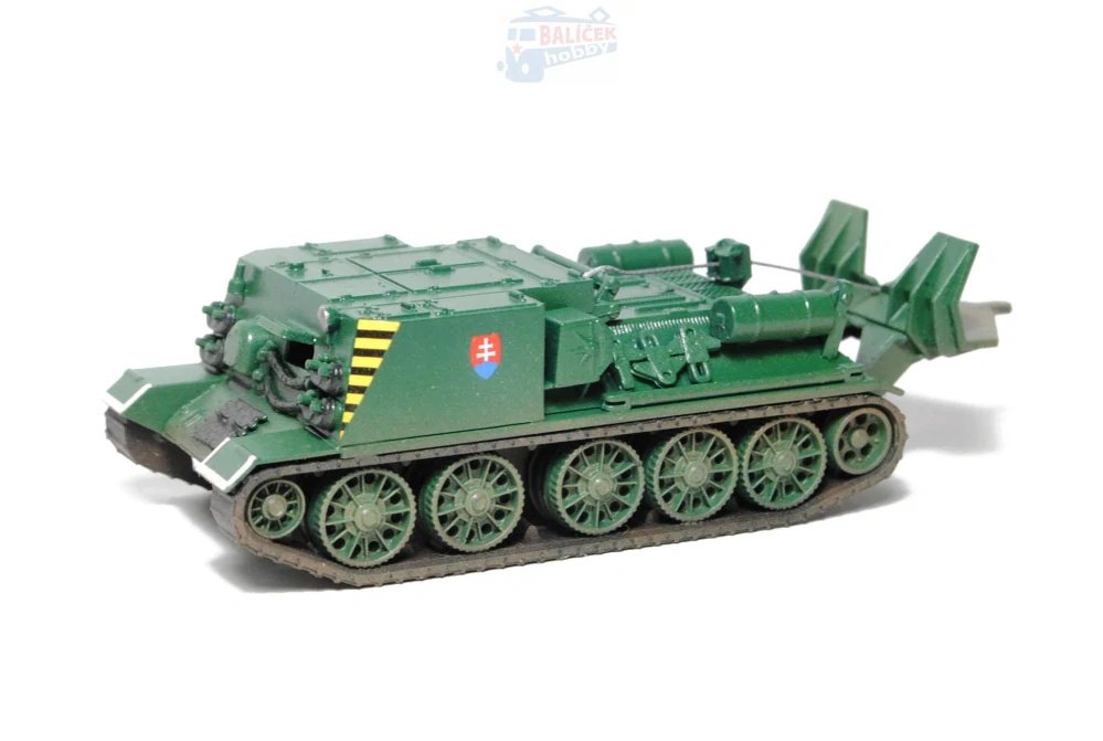 Kompletní plastiková stavebnice vyprošťacího tanku. Obsahuje probarvené plastikové výlisky na sestavení modelu a sadu obtisků ČSD, ČD a ŽSR, epocha IV.-V..