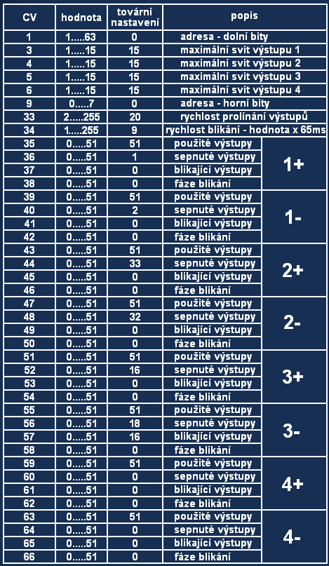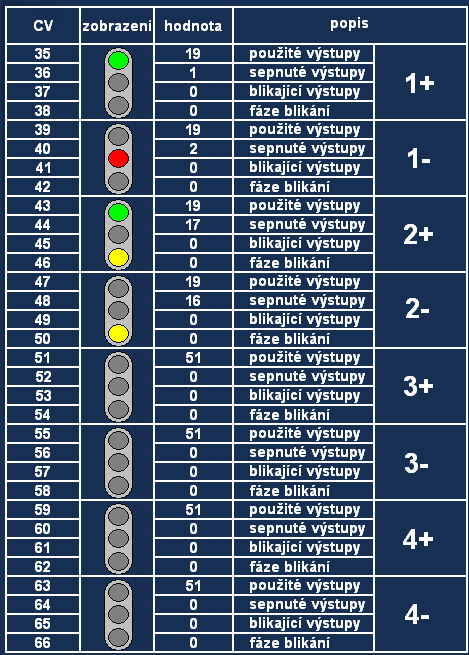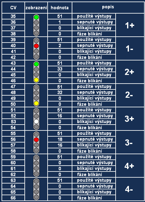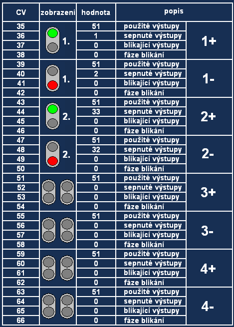 V továrním nastavení je dekodér naprogramován pro ovládání čtyřsvětelného návěstidla.