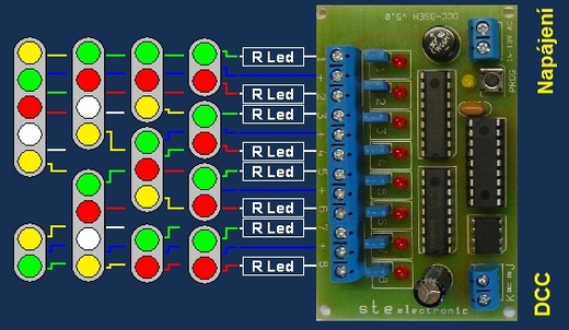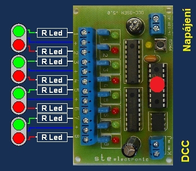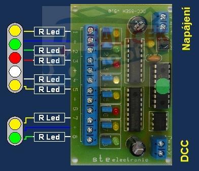 Žárovková návěstidla se zapojují přímo, návěstidla osazené LED diodami se musí zapojit přes ochranné rezistory, jinak dojde ke zničení LED v návěstidle a může následně dojít k destrukci výstupních obvodů dekodéru.K částečné eliminaci tohoto problému jsou výstupy dekodéru opatřeny rezistory 100Ω. Výstupy dekodéru jsou opatřeny červenými LED diodami, aby byla možnost jej naprogramovat i bez připojených výstupů a i pro hledání závady pod panelem vidíme stav výstupů. Po vyjmutí AMP propojky na dekodéru je výstup vyveden přes ochranný rezistor 1kohm, takže není externí rezistor nutný (pokud je svit LED vyhovující).