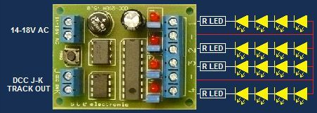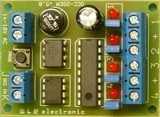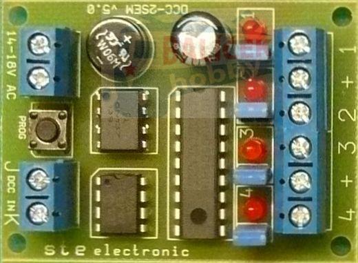 Dekodér má čtyři nezávislé výstupy, opatřené LED diodami, aby byla možnost jej naprogramovat bez připojených výstupů a i pro hledání závady pod panelem vidíme stav výstupů i na dekodéru. Výstupům můžeme přidělit samostatnou adresu, potom spíná a rozpíná každý výstup zvlášť, nebo jednomu výstupu přidělit „adresu +" a druhému „adresu -".Potom se výstupy přepínají mezi sebou.