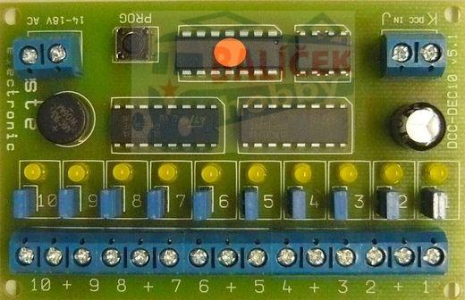 Výstupy dekodéru jsou opatřeny žlutými LED diodami, aby byla možnost jej naprogramovat i bez připojených výstupů a i pro hledání závady pod panelem vidíme stav výstupů.