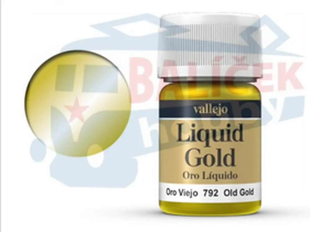 Liquid Gold je řada alkoholových barev z permanentních metalických pigmentů určená pro zlacení, dekorování, retušování, restaurování a modelářství. Barvy jsou na alkoholové bázi, vyrobeny z metalických pigmentů, což přináší opravdový metalický efekt, než kdyby byly na vodní bázi. Jsou extrémně odolné a světlostálé. Barvy by měly být před použitím důkladně protřepány nebo zamíchány. Pokud by bylo nutné barvy dále ředit, měl by být přidán pouze 96% čistý alkohol, aby se zabránilo oxidaci. Barvy nelze mísit s vodou, protože sebemenší kontakt s vodou způsobí, že opravdové pigmenty kovů začnou v lahvičce rezavět. Barvy se můžou mísit mezi sebou pro vytvoření dalších barevných variací. Schnou velmi rychle a drží na každém povrchu. Barvy můžete i stříkat airbrush pistolkou, podle potřeby je nařeďte 96% čistým alkoholem a nikdy ne více jak 30%. Štětec a pistolka se čistí alkoholem. Barvy jsou hořlavé kvůli obsahu alkoholu, ale neobsahuje xylen ani toluen. Protože to jsou alkoholové barvy, musíte zvolit airbrush pistolku, která nemá v cestě barvy žádné gumové těsnění, doporučujeme BD116C, BD183, BD184, BD320.