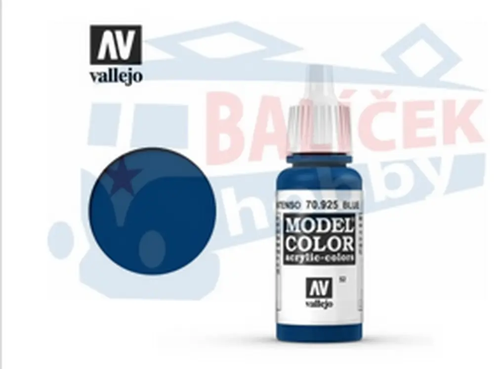 Barva Vallejo Model Color 70925 Blue (17ml) Popis Vallejo Model Color je řada akrylových barev speciálně vyrobených pro plastikové modelářství. Barvy jsou krycí, na vodní bázi, určené pro nanášení štětcem. Dobře drží na pryskyřici, plastech a kovu. Mohou být mezi sebou míchány. Po zaschnutí jsou... celý popis