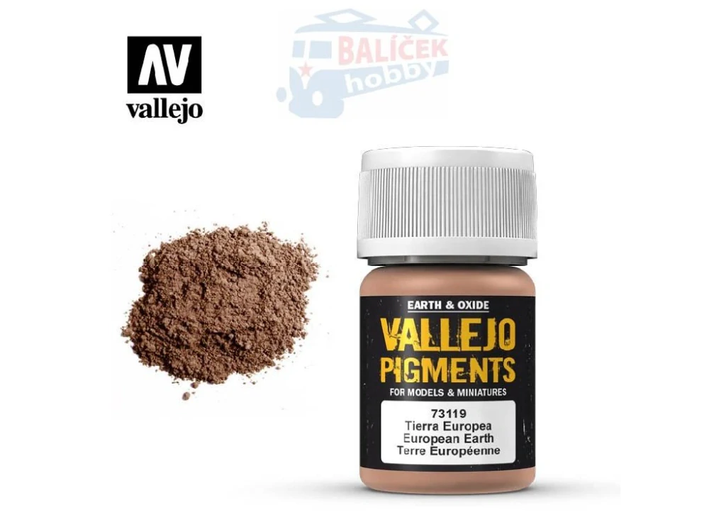 Vallejo Pigments 73119 European Earth (35ml) Popis Pigmenty se používají pro vytvoření efektu zvětrávání a stárnutí povrchových úprav vozidel, pancéřování, opevnění a u staveb. Jsou ideální pro vytváření nahromaděného prachu, nečistot a bahna, které vznikají časem a přirozenou erozí. Pigment... celý popis
